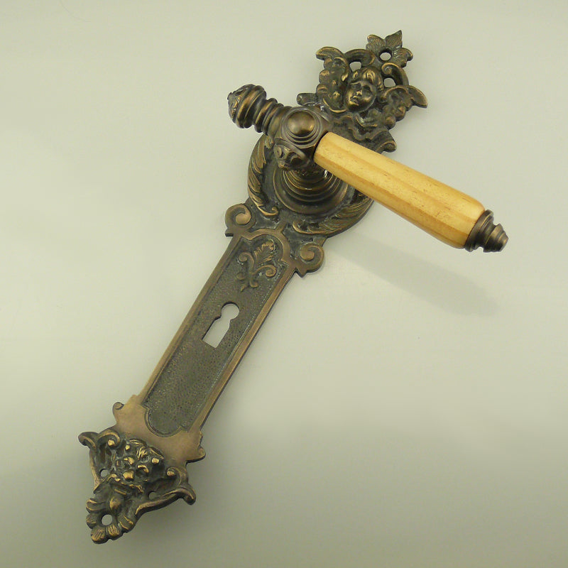 Die typischen, ausdrucksstarken Ornemante der Gründerzeit finden sich auf dieser hochwertigen Drückergarnitur im historischen Stil. Der massive Drücker mit einem Griffteil aus Hartholz (Pinien Optik) liegt angenehm in der Hand.