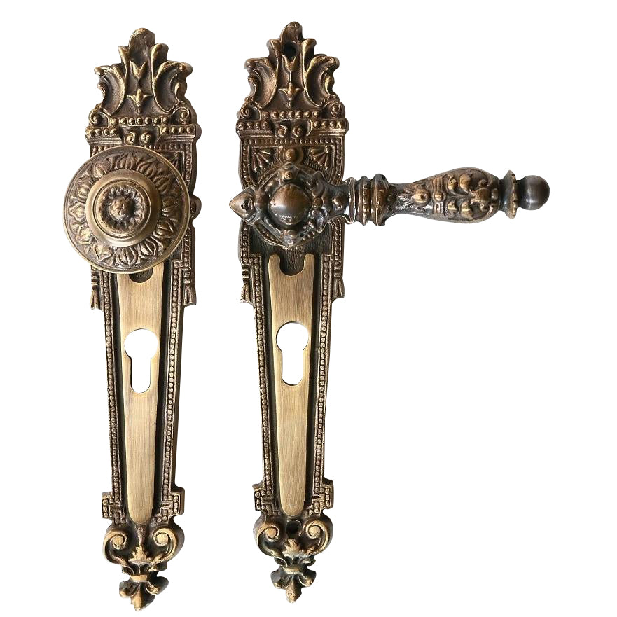 Große und massive Gründerzeit Garnitur für Haustüren und Wohnungseingänge. Drücker, Schilder und Knopf sind mit den typisch oppulenten Historismus Verzierungen geschmückt. Das Bild zeigt die Ausführung als Wechselgarnitur (außen Knopf, innen Drücker) mit patinierter Oberfläche. Auf Wunsch auch erhältlich als Drückergarnitur (außen und innen mit Drücker).
