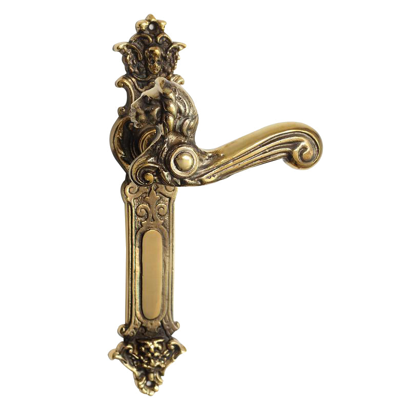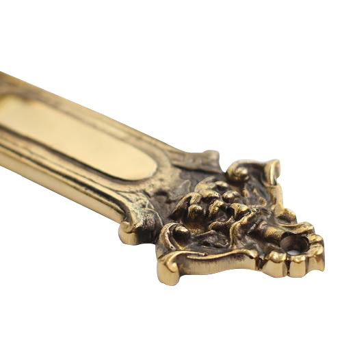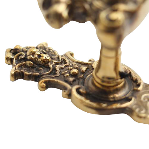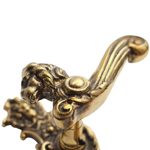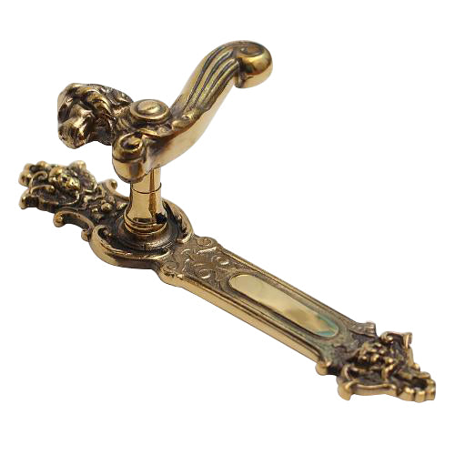 Gründerzeit typisch sind auf dieser außergewöhnlichen historischen Garnitur viele Verzierungen zu erkennen. Das Besondere an diesem Beschlag ist jedoch der Löwenkopf, der den schweren Türdrücker ziert. Massives Messing, in Handarbeit gegossen und nachbearbeitet, machen diesen Gründerzeit Beschlag zu einem soliden, stilvollen Türöffner.