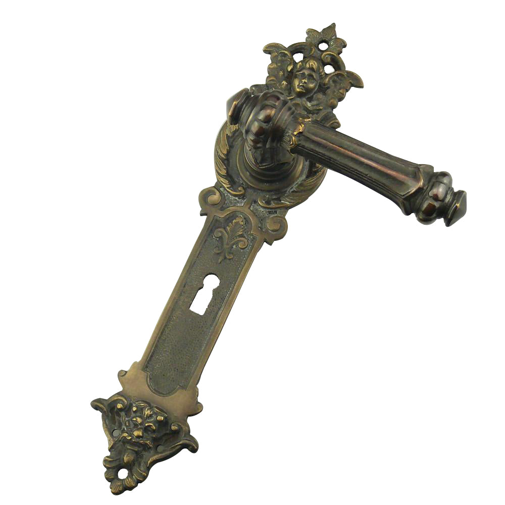 Gründerzeit Drückergarnitur mit stiltypischer, oppulenter Ornamentik. Gefertigt wird diese aussagekräftige Garnitur aus massivem Messing in Handarbeit. Als abschließender Arbeitsschritt wird die Oberfläche poliert, patiniert (Bild zeigt dunkel patinierte Ausführung) oder vernickelt. Die Oberfläche verändert sich durch den natürlichen Patinierungsprozess mit der Zeit - wie Sie es von historischen Beschlägen kennen. Dieses Modell gibt es auch in der Ausführung aus Gusseisen (schwarz).