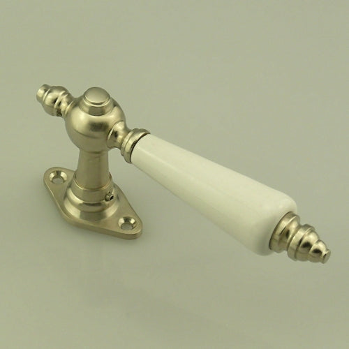 Einseitiger Fenstergriff in Anlehung an den Stil der Gründerzeit. Aus massivem Messing in Handarbeit gefertigt. Mit 7 mm Vierkantloch und Schraubrosette nach DIN (Schraubabstand 43 mm). Besonders geeignet für moderne Dreh-/Kippfenster in Verbindung mit der Rasterrosette. Die Abbildung zeigt den Fenstergriff in matt vernickelter Ausführung mit Griffstück aus weißer Keramik.In der Ausführung Messing poliert und patiniert wird kein zusätzlicher Klarlack aufgebracht. Die Oberfläche verändert sich daher durch den natürlichen Patinierungsprozess mit der Zeit. Genauso, wie es schon vor 100 Jahren der Fall war. Sollten Sie eine andere Ausführung wünschen, wie z.B. Ausstattung mit runder Aufschlagrosette für alte Kastenfenster Ausführung als abschließbare Variante dann nehmen Sie einfach Kontakt zu mir auf.
