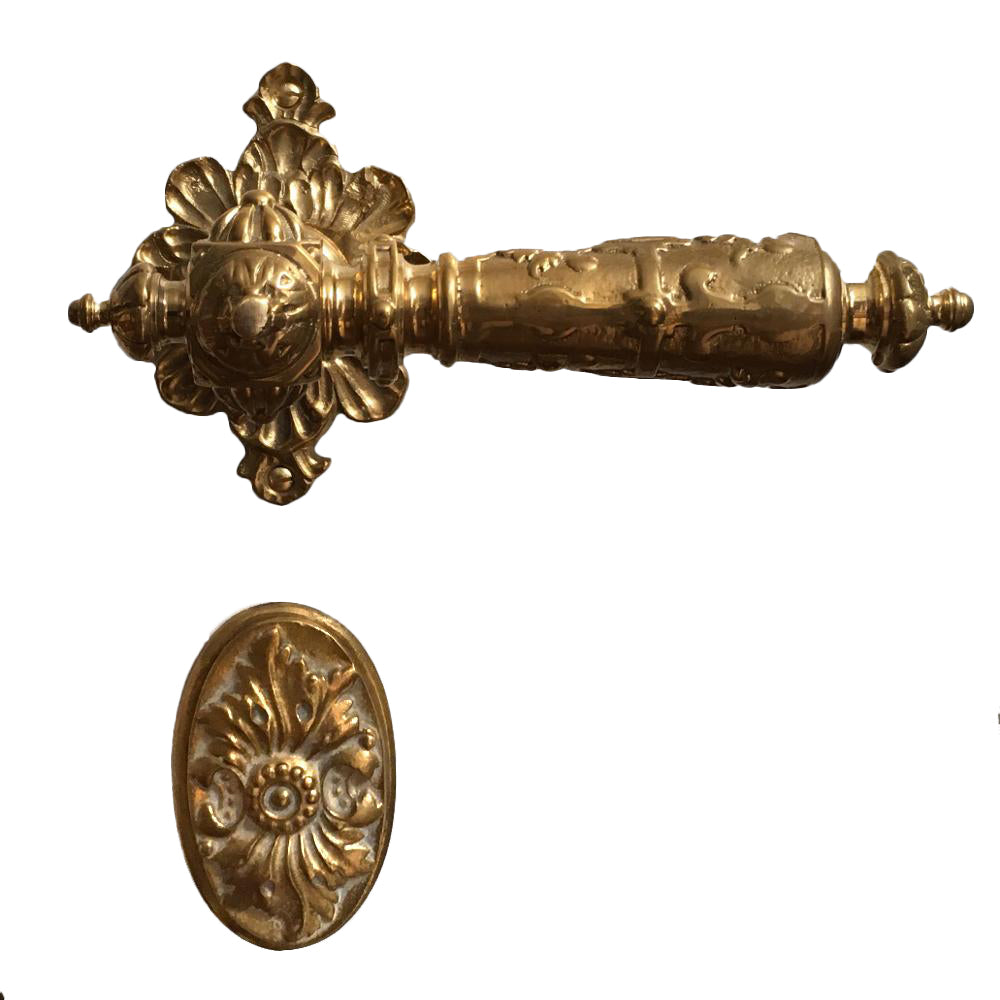 Großer Gründerzeit Haustürdrücker mit Rosetten. Schwere Ausführung aus massivem Messing mit der typisch opulenten Ornamentik der Gründerzeit.