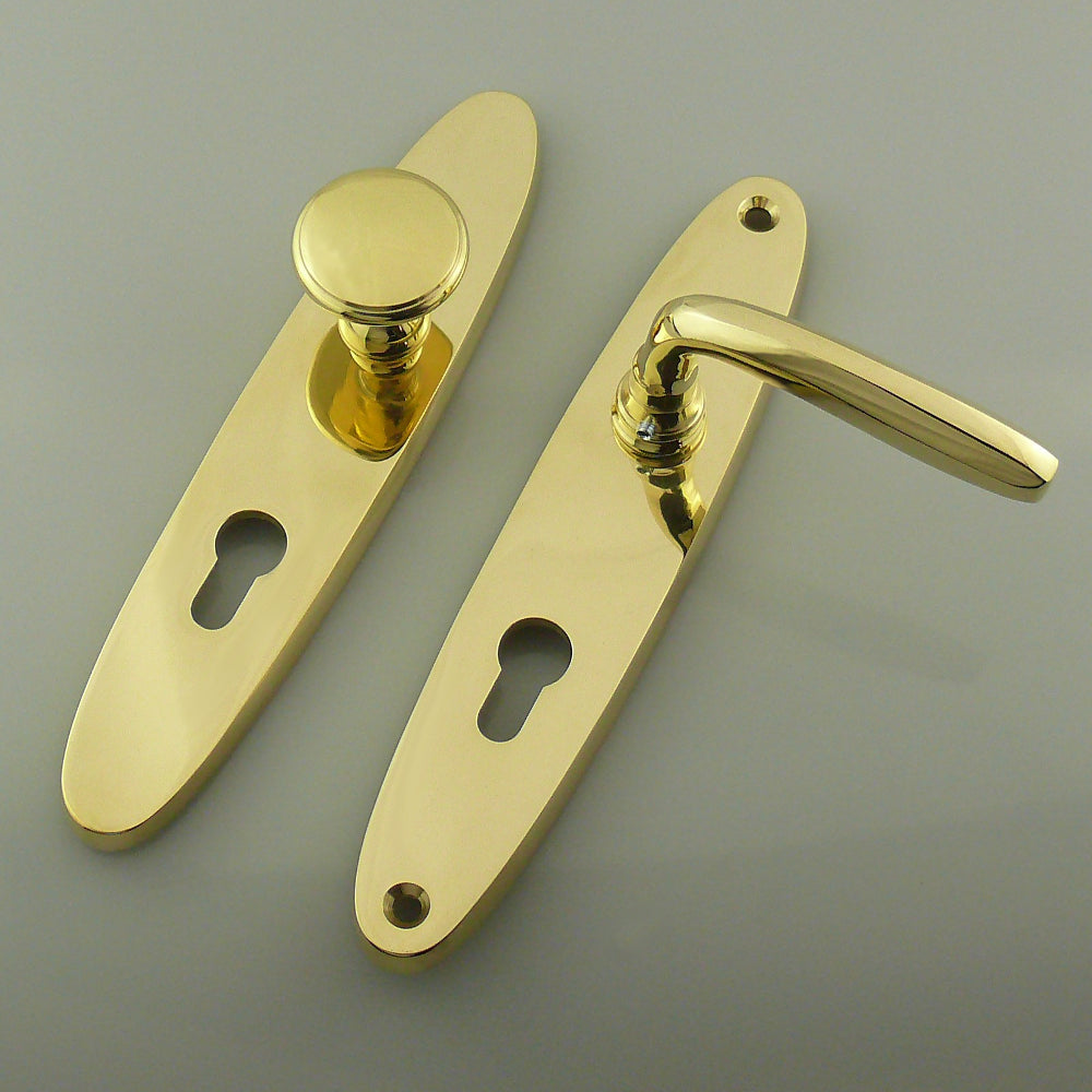 Die schlichte, ovale Form der Schilder, sowie der geradlinige Drücker und Knopf passen zu vielen Einrichtungsstilen. Dieser historische Beschlag schmückt Ihre Wohnungs- oder Hauseingangstür und verleiht Ihr einen edlen Glanz. Auch dieser Beschlag wird in Handarbeit (Sandgussverfahren) gefertigt. Die Oberfläche wird nach Wunsch poliert (Bild 2, 3, 4), patiniert, vernickelt oder verchromt (Bild 1). Der natürliche Patinierungsprozess verändert die Oberfläche mit der Zeit - so wie Sie es von historischen Beschlägen kennen. Sie können die Garnitur als Wechsel- (außen Knopf, innen Drücker) oder Drückergarnitur (außen und innen Drücker) bestellen. Als Standard erhalten die Schilder eine PZ-Lochungen mit 72 oder 92 mm Abstand (DIN). Andere Schlüssellochformen oder -abstände sind auch möglich - geben Sie Ihre Wünsche einfach während des Bestellvorgangs an. Die Verschraubung der Garnitur erfolgt von der Innenseite, so dass ein Abschrauben von außen nicht möglich ist. Die Schilder sind innen 6 mm und außen 10 mm stark. Andere Schildstärken und auch ein Kernziehschutz (siehe Bild 1 und 4) sind gegen Aufpreis lieferbar.