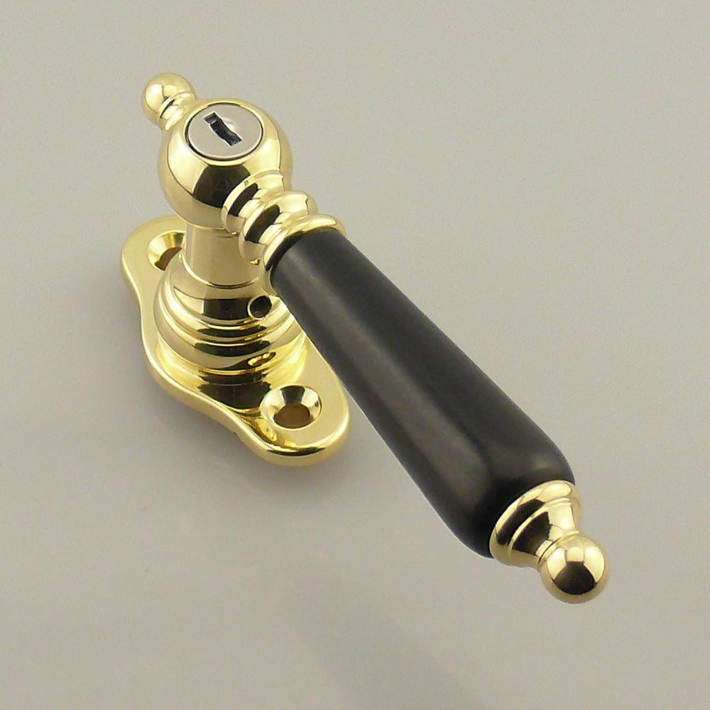Schöner zeitloser Fenstergriff zum abschließen. Dieser Griff ist auf Wunsch auch in einer nicht abschließbaren Variante erhältlich.Gefertigt wird der abschließbare Fenstergriff aus massivem Messing in Handarbeit. Das Griffstück ist aus schwarz lackiertem Holz. Die Schraubrosette erhält 2 gesenkte Bohrungen mit einem DIN-Abstand von 43 mm. Der Hals ist mit einem 7x7 mm Vierkantloch versehen. Der abschließbare Fenstergriff ist geeignet für den Einsatz an alten oder neuen Fenstern. Die Oberfläche wird nicht versiegelt, so dass diese sich in der polierten und patinierten Ausführung mit der Zeit verändern wird. Ein natürlicher Patinierungsprozess, den Sie auch von historischen Beschlägen kennen.