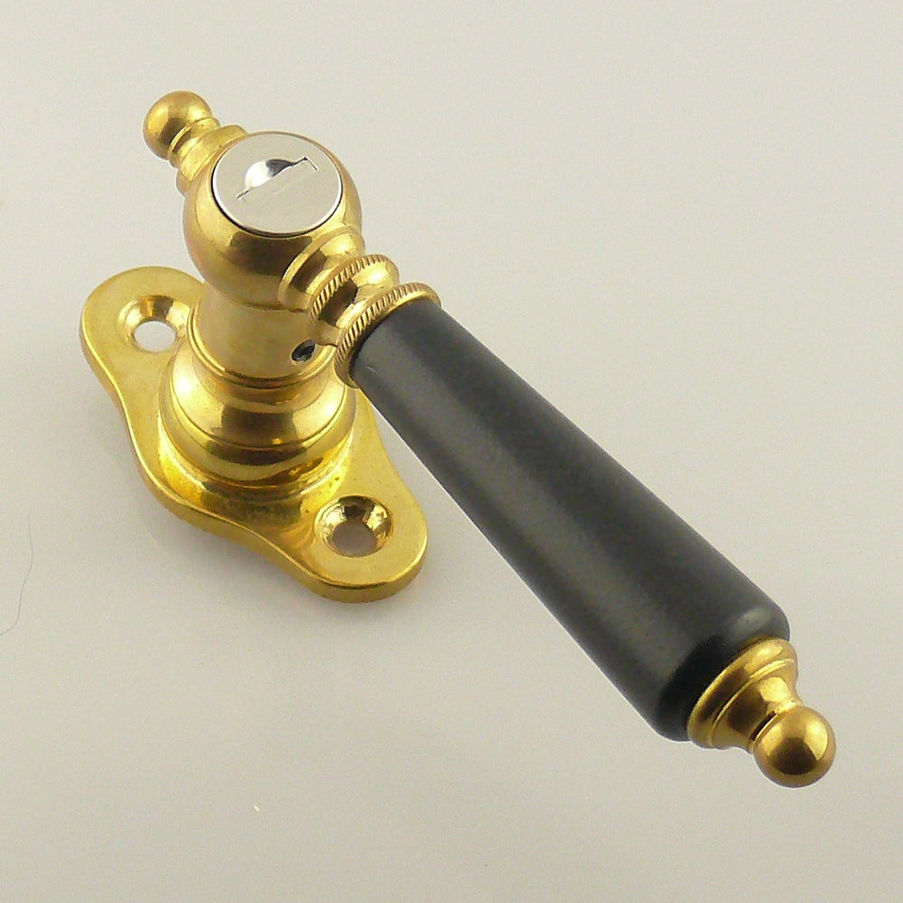 Schöner Gründerzeit Fenstergriff mit Schließzylinder zum abschließen. Der Griff ist auch in einer nicht abschließbaren Variante erhältlich. Gefertigt wird der abschließbare historische Fenstergriff aus massivem Messing in Handarbeit (Sandgussverfahren), das Griffteil ist aus schwarz lackiertem Holz. Die Schraubrosette erhält 2 gesenkte Bohrungen mit einem Abstand von 43 mm nach DIN. Der Hals ist mit einem 7x7 mm Vierkantloch versehen und etwas länger als die Unterseite der Schraubrosette. An modernen Fenstern mit einer Aussparung rund um das Vierkantloch kann er also problemlos eingesetzt werden. Ein versiegelnder Klarlack wird für die Oberfläche nicht verwendet, so dass diese sich in der polierten und patinierten Ausführung mit der Zeit verändern wird. Ein natürlicher Patinierungsprozess, den Sie auch von historischen Beschlägen kennen.
