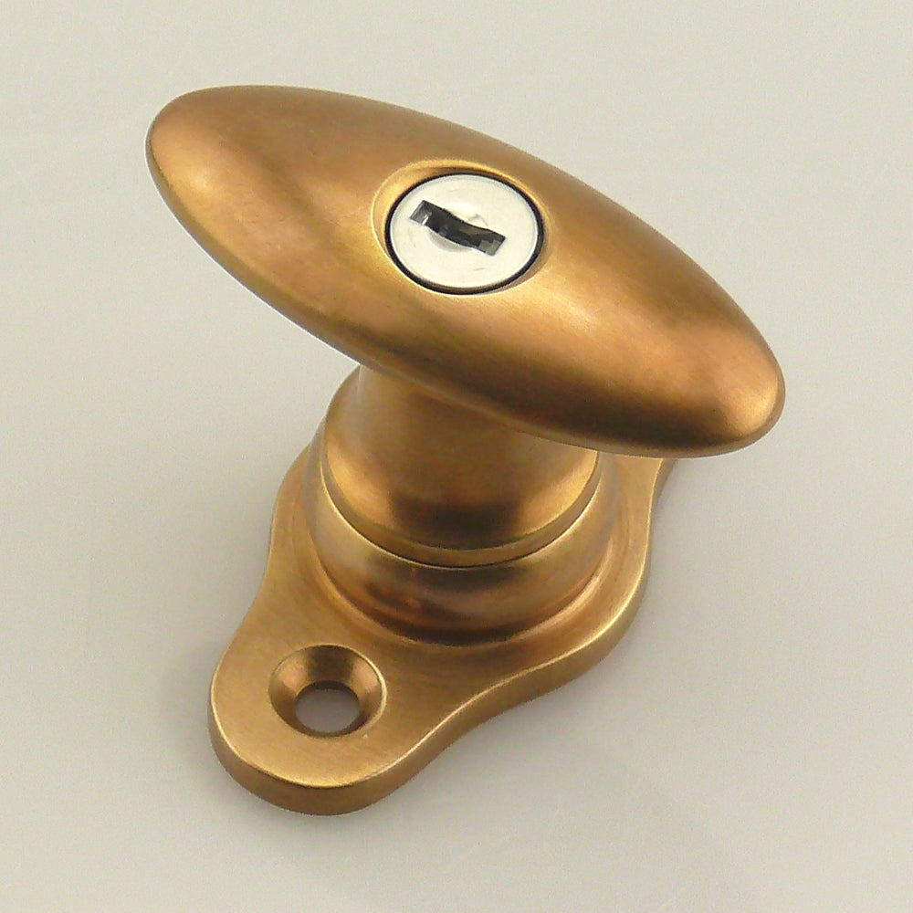 Kleine, schlichte, ovale Fensterolive im Stil der 20'er Jahre - hier in abschließbarer Ausführung mit 2 Schlüsseln. Dieses Modell ist auch als nicht abschließbare Variante lieferbar. Dieser historische Fenstergriff der Bauhaus Epoche wird in Handarbeit aus massivem Messing gefertigt. Im Sandgussverfahren erfolgt die Formgebung, anschließend wird per Hand nachbearbeitet. Die Schraubrosette ist versehen mit 2 Lochungen für die Schrauben im DIN-Abstand 43 mm. Auf dem Bild ist die Variante mit patinierter Oberfläche zu sehen. Auf den Einsatz eines zusätzlichen Klarlacks verzichten wir, so dass sich die Oberfläche in der polierten und patinierten Ausführung mit der Zeit durch den natürlichen Patinierungsprozess verändern wird. So, wie es auch bei historischen Fensteroliven üblich ist.