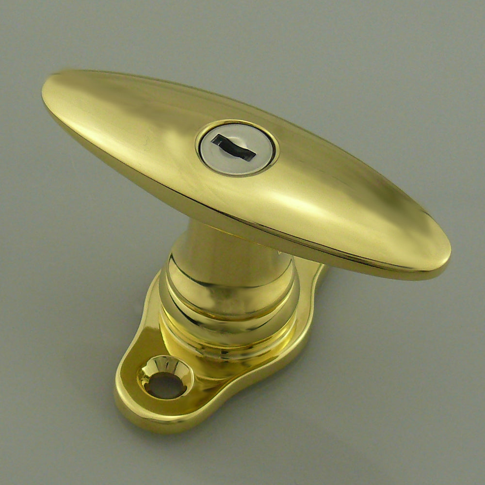 Schlichte ovale Fensterolive im Stil der 20'er Jahre - hier in abschließbarer Ausführung mit 2 Schlüsseln. Dieses Modell ist auch als nicht abschließbare Variante lieferbar. Aus massivem Messing wird dieser historische Fenstergriff der Bauhaus Epoche gefertigt. Im Sandgussverfahren erfolgt die Formgebung, anschließend wird per Hand nachbearbeitet. Die Schraubrosette ist versehen mit 2 Lochungen für die Schrauben im DIN-Abstand 43 mm. Auf den Einsatz eines zusätzlichen Klarlacks verzichten wir, so dass sich die Oberfläche in der polierten (siehe Bild 2) und patinierten Ausführung mit der Zeit durch den natürlichen Patinierungsprozess verändern wird. So, wie es auch bei historischen Fensteroliven üblich ist. Bild 1 zeigt die abschließbare Bauhaus Olive in der Ausführung mit glänzend vernickelter Oberfläche.