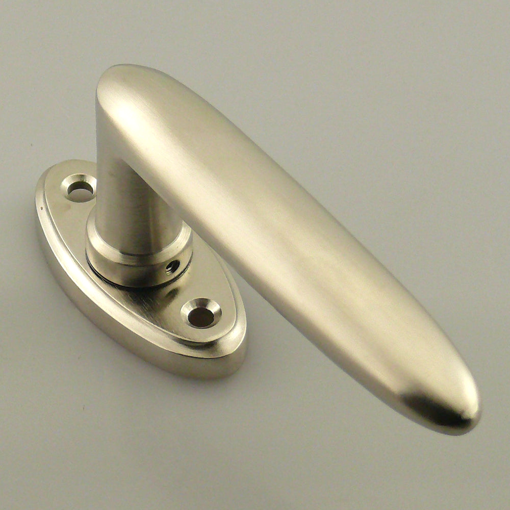 Moderner Fenstergriff in zeitlosem Design. Durch die glatte und leicht geschwungene Form passte er sowohl in moderne als auch historische Objekte. Gefertigt aus massivem Messing in Handarbeit. Versehen mit einem 7 mm Vierkantloch und einer Schraubrosette nach DIN (Schraubabstand 43 mm) ist er auch für moderne Fenster. Auch die Kombination mit einer Rasterrosette für moderne Dreh-/Kippfenster in Verbindung ist möglich. Die Abbildung zeigt den Fenstergriff in matt vernickelter Ausführung. In der Ausführung Messing poliert und patiniert wird kein zusätzlicher Klarlack aufgebracht. Die Oberfläche verändert sich daher durch den natürlichen Patinierungsprozess mit der Zeit. Genauso, wie es schon vor 100 Jahren der Fall war. Sollten Sie eine andere Ausführung wünschen, wie z.B. Ausstattung mit runder Aufschlagrosette für alte Kastenfenster Ausführung als abschließbare Variante, dann nehmen Sie einfach Kontakt zu mir auf.
